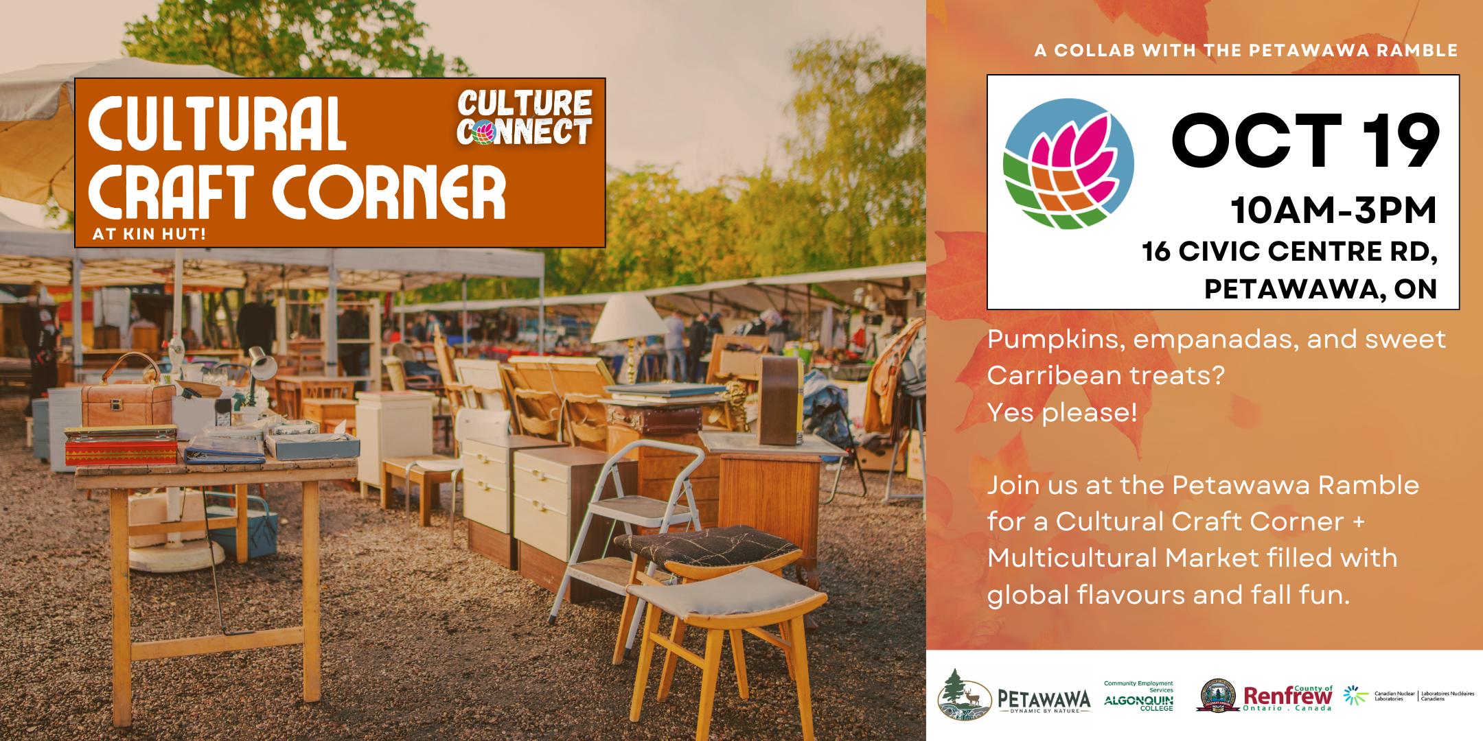 The Local Immigration Partnership – Lanark & Renfrew are so excited to be partnering with the Town of Petawawa this Culture Connect Fall Edition for a Multicultural Market and Cultural Craft Corner as part of the Petawawa Ramble! The event will feature cultural vendors, food, crafts and activities. This event will be hosted at the same time and location as the Children’s Harvest Activities Day with inflatables and other vendors at the Container Market.